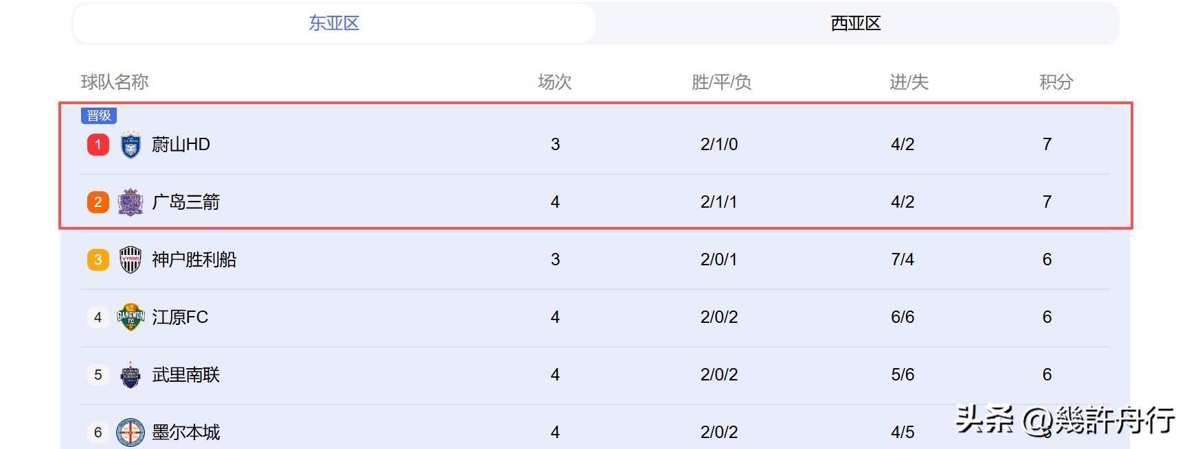 看新的亚冠东亚区积分榜,真让人心里发凉,蔚山HD稳坐第一,广岛三箭紧随其后,两队同积7分。