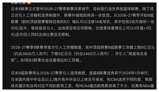 为了进一步提升日本篮球的水平,日本篮协制定了一系列新规,全面升级B联赛。其中最重要的规定之一是将B1联赛改名为B超联赛,而B2和B3保持不变,维持升降级制度。另一个重要规定是放开对外援的限制,从26-27赛季开始,每支B超联赛俱乐部可以注册两名外援以及一名亚洲外援,还有一名归化球员,且没有上场时间限制。这将大大提升B联赛的整体竞争力。