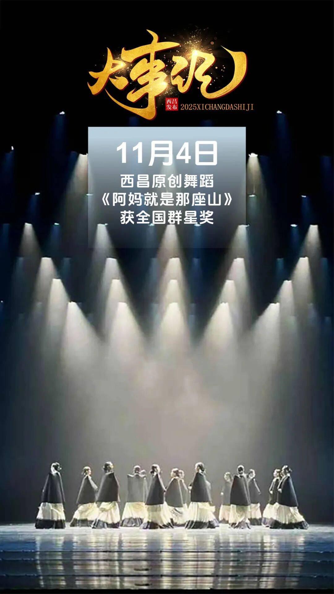 11月4日,由文化和旅游部主办的第二十届群星奖获奖名单正式揭晓。西昌原创舞蹈《阿妈就是那座山》(原名《山褶》)获群星奖,是西昌文艺作品首次获此殊荣。