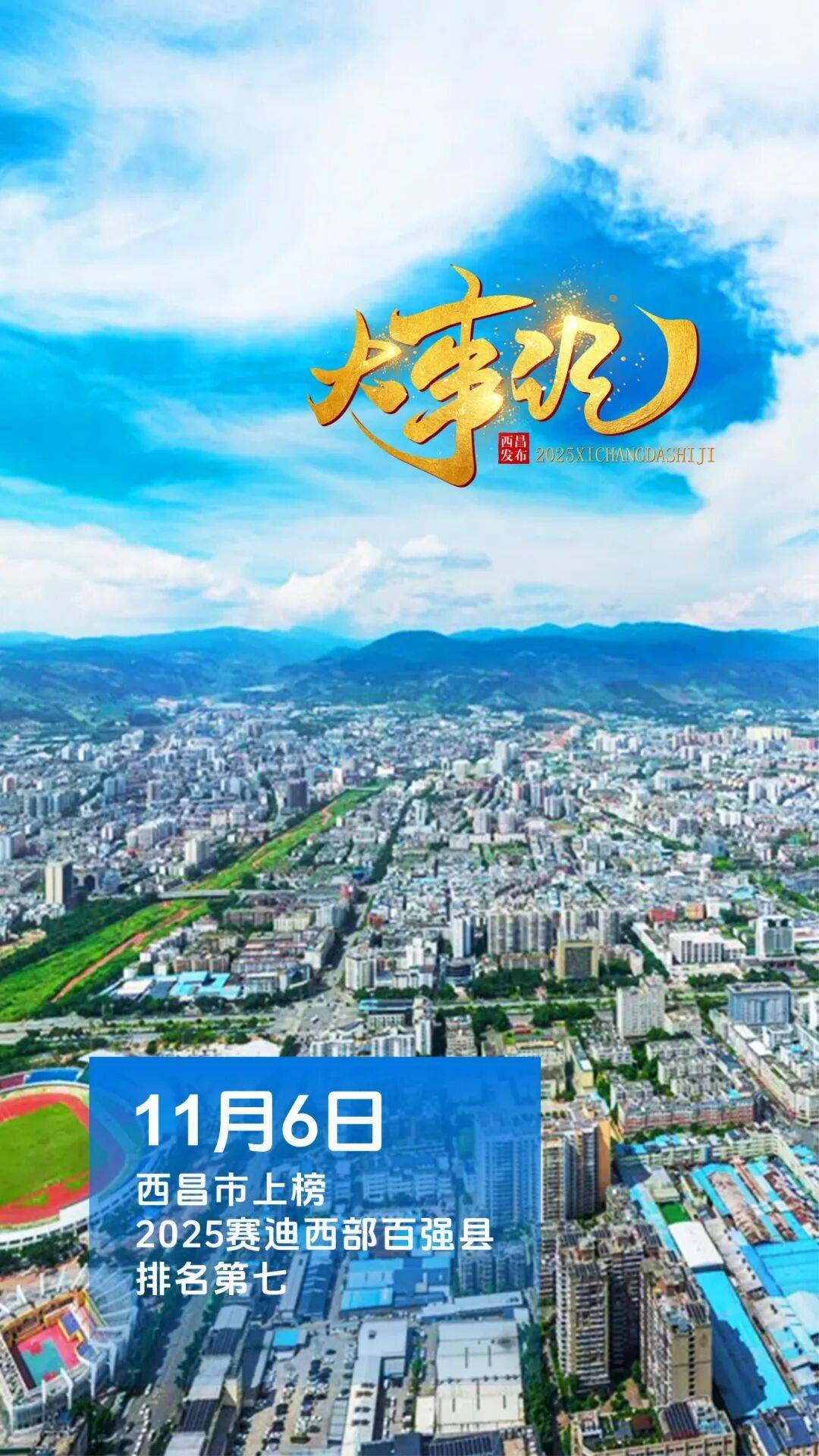 11月6日,赛迪方略县域经济研究中心、赛迪顾问城市经济研究中心发布《2025中西部县域、城区经济高质量发展研究》。其中,西昌市上榜2025赛迪西部百强县,排名第七位。