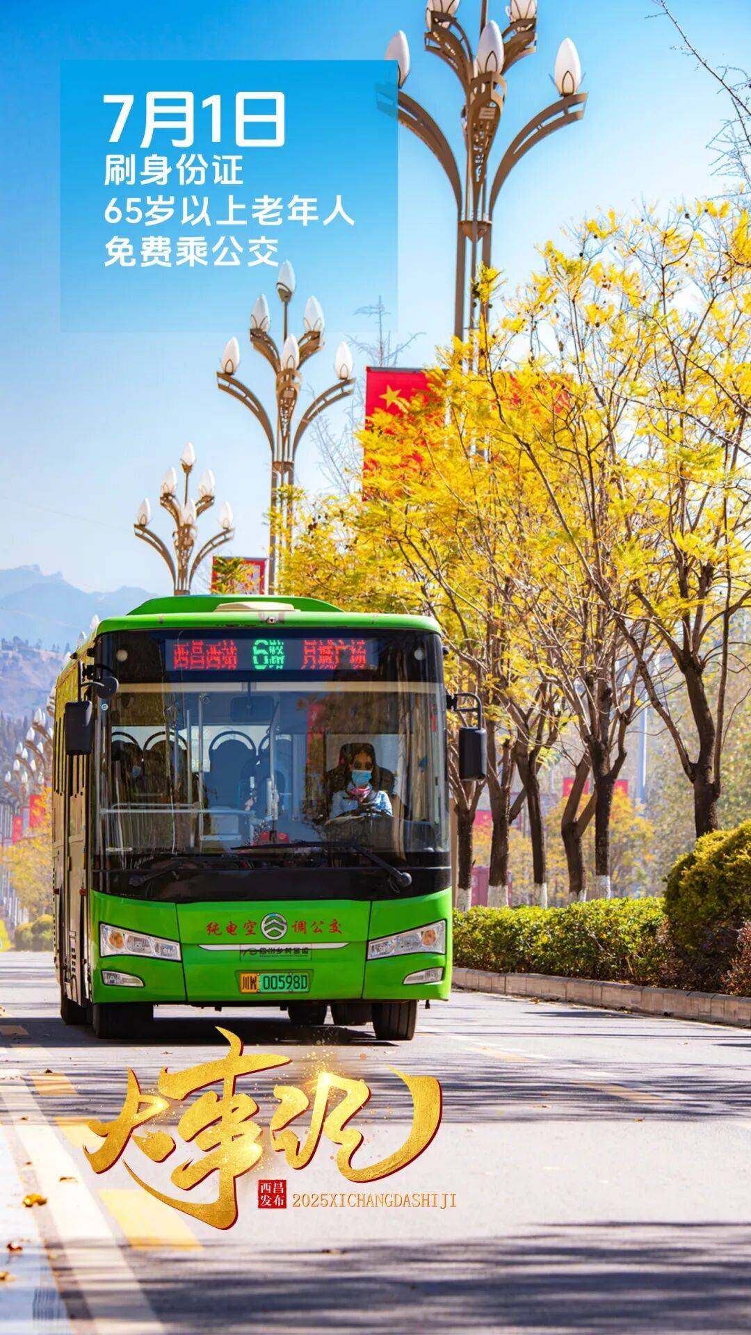 7月1日起,西昌市公交惠民服务举措进行调整:65岁及以上老年人(不限户籍)持有效公交IC卡或本人居民身份证刷卡(证),可免费乘坐公交车(定制公交除外)。