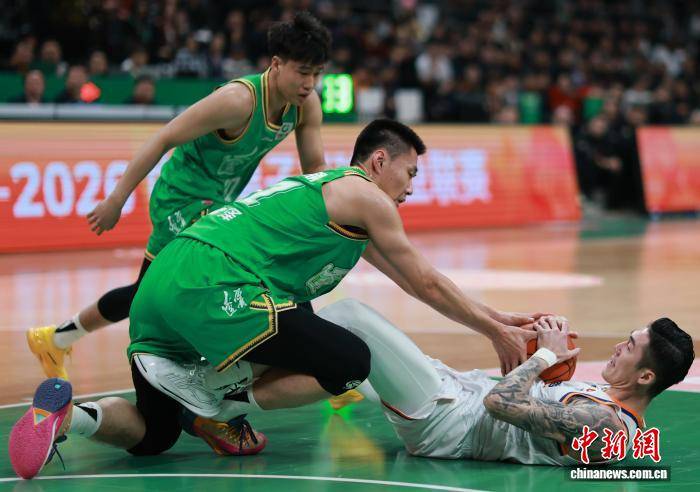 12月31日,在辽宁沈阳举行的2025-2026赛季中国男子篮球职业联赛(CBA)常规赛第9轮比赛中,辽宁本钢队65比91不敌上海久事队。图为上海久事队球员王哲林(中)在比赛中。中新社记者 于海洋 摄