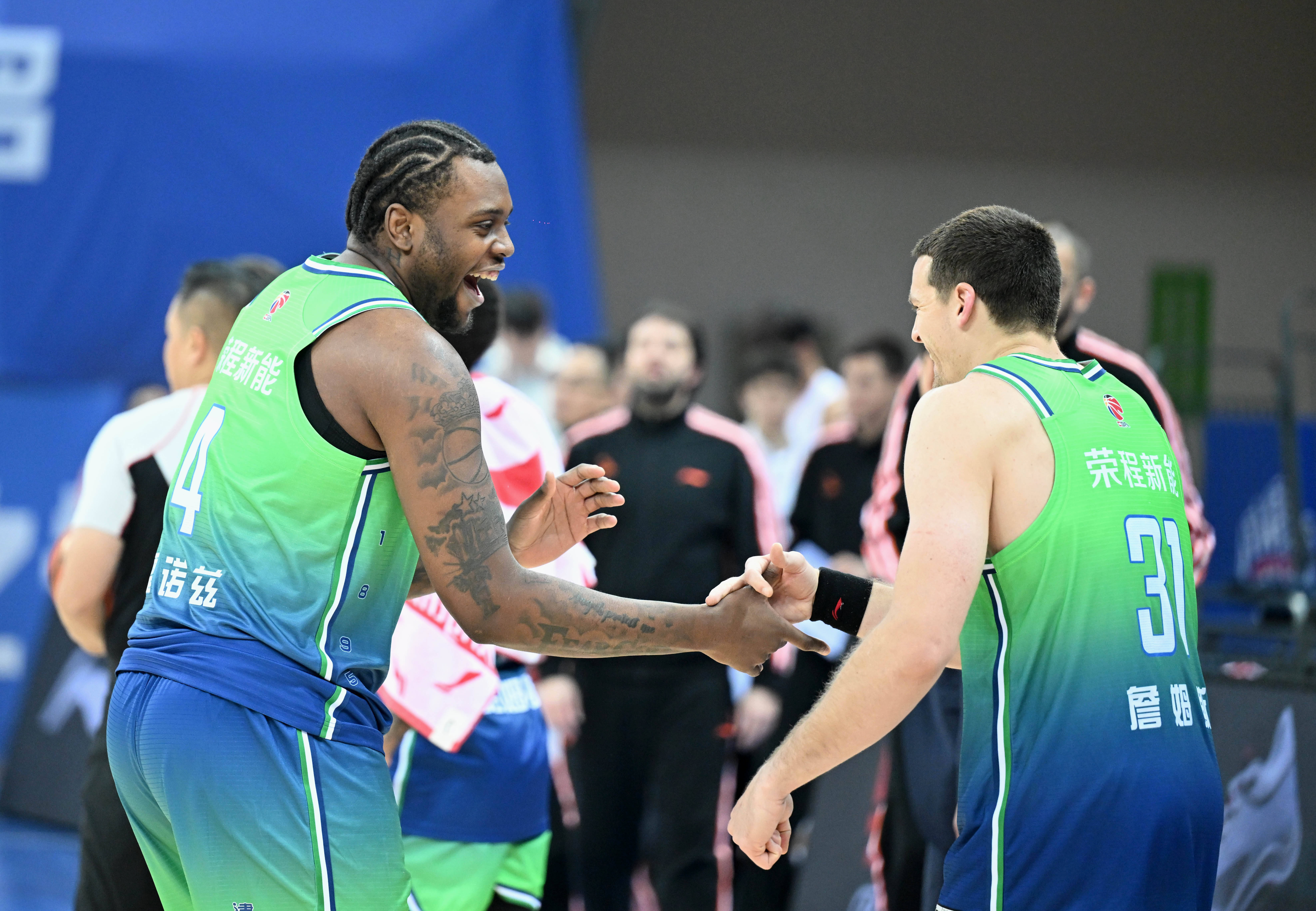 1月14日,天津先行者队球员雷诺兹(左)和队友詹姆斯在比赛后庆祝。 新华社记者 赵子硕 摄