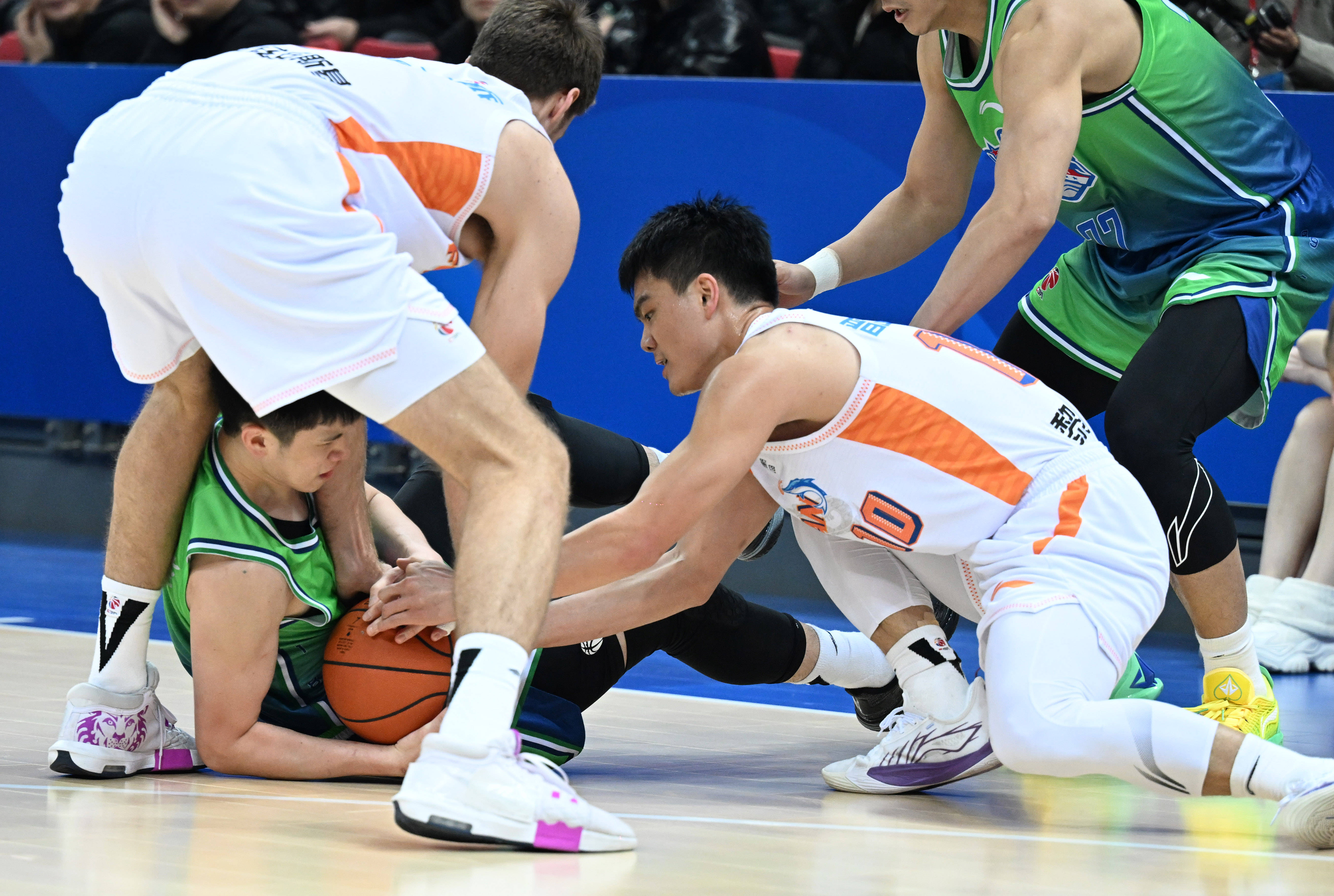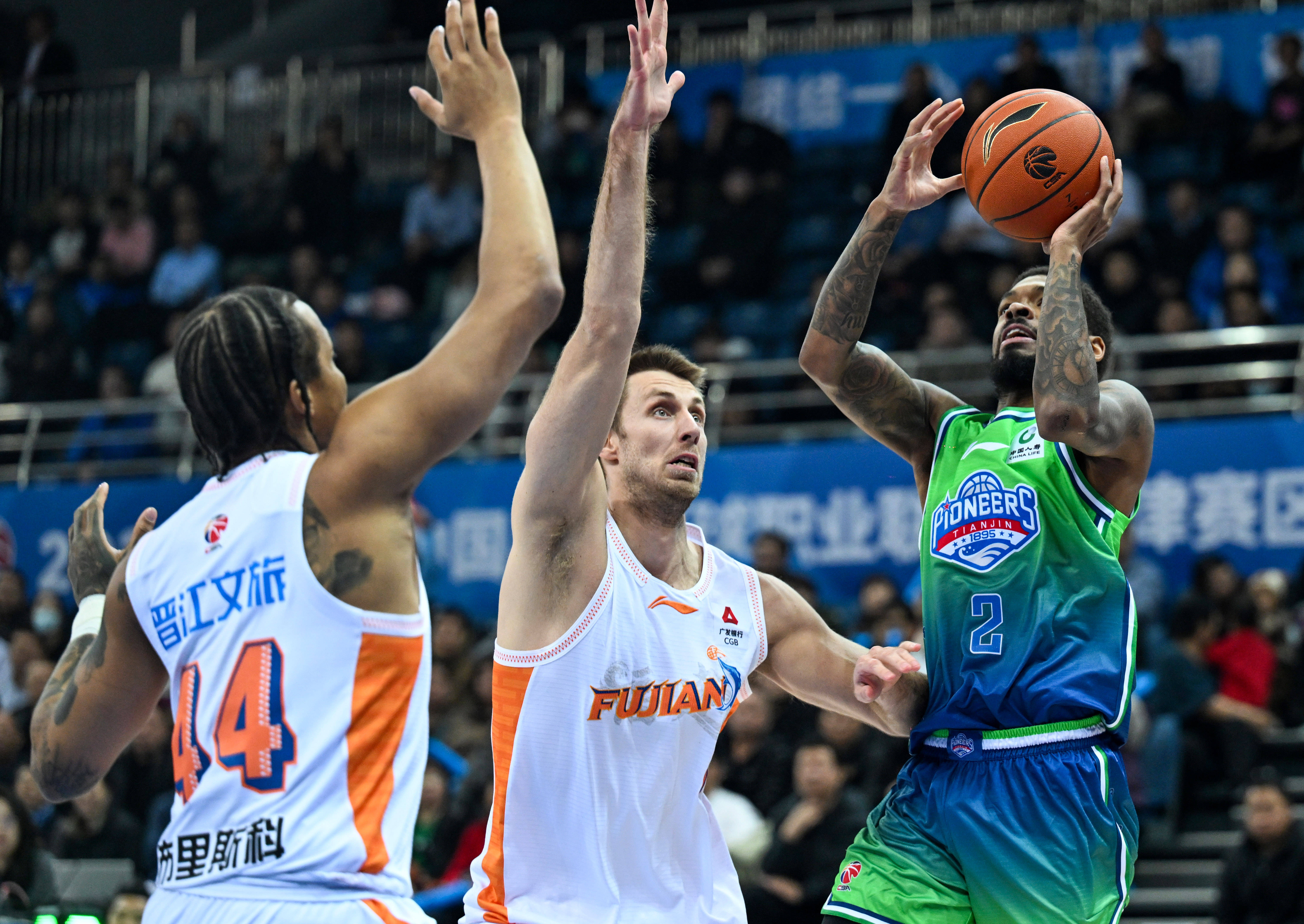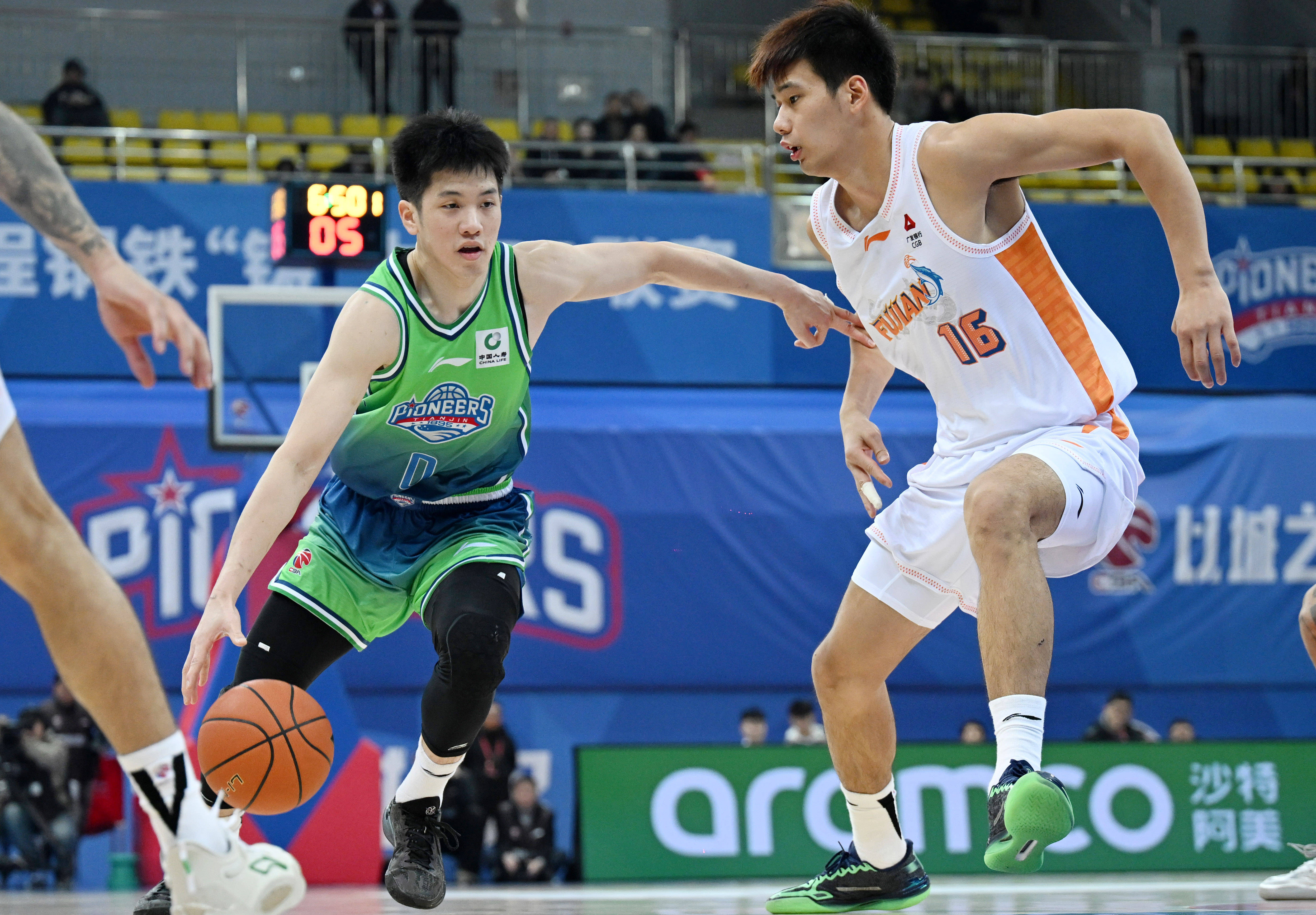 1月14日,天津先行者队球员林庭谦(左下)和福建晋江文旅队球员黎伊扬(右)在比赛中拼抢。 新华社记者 赵子硕 摄