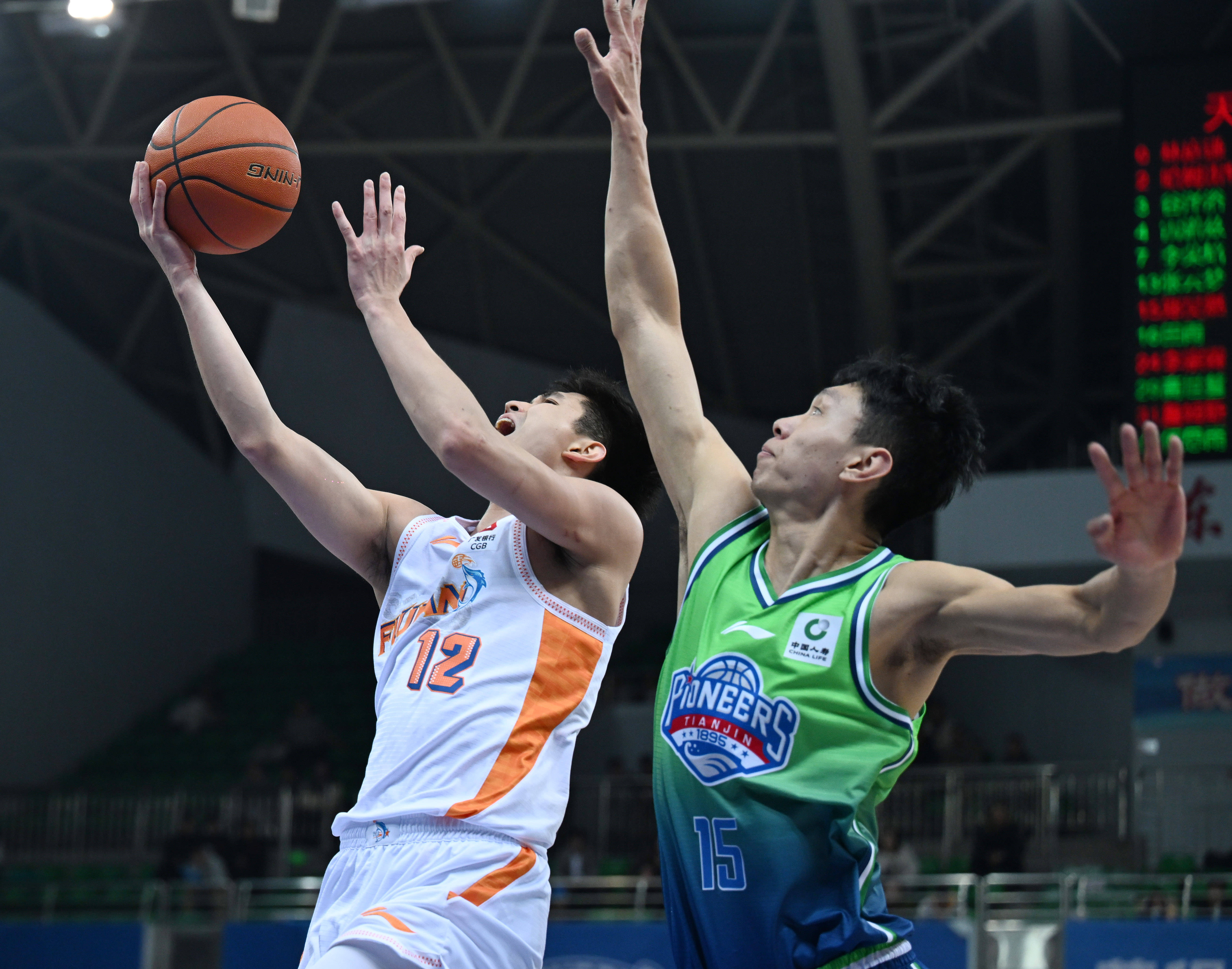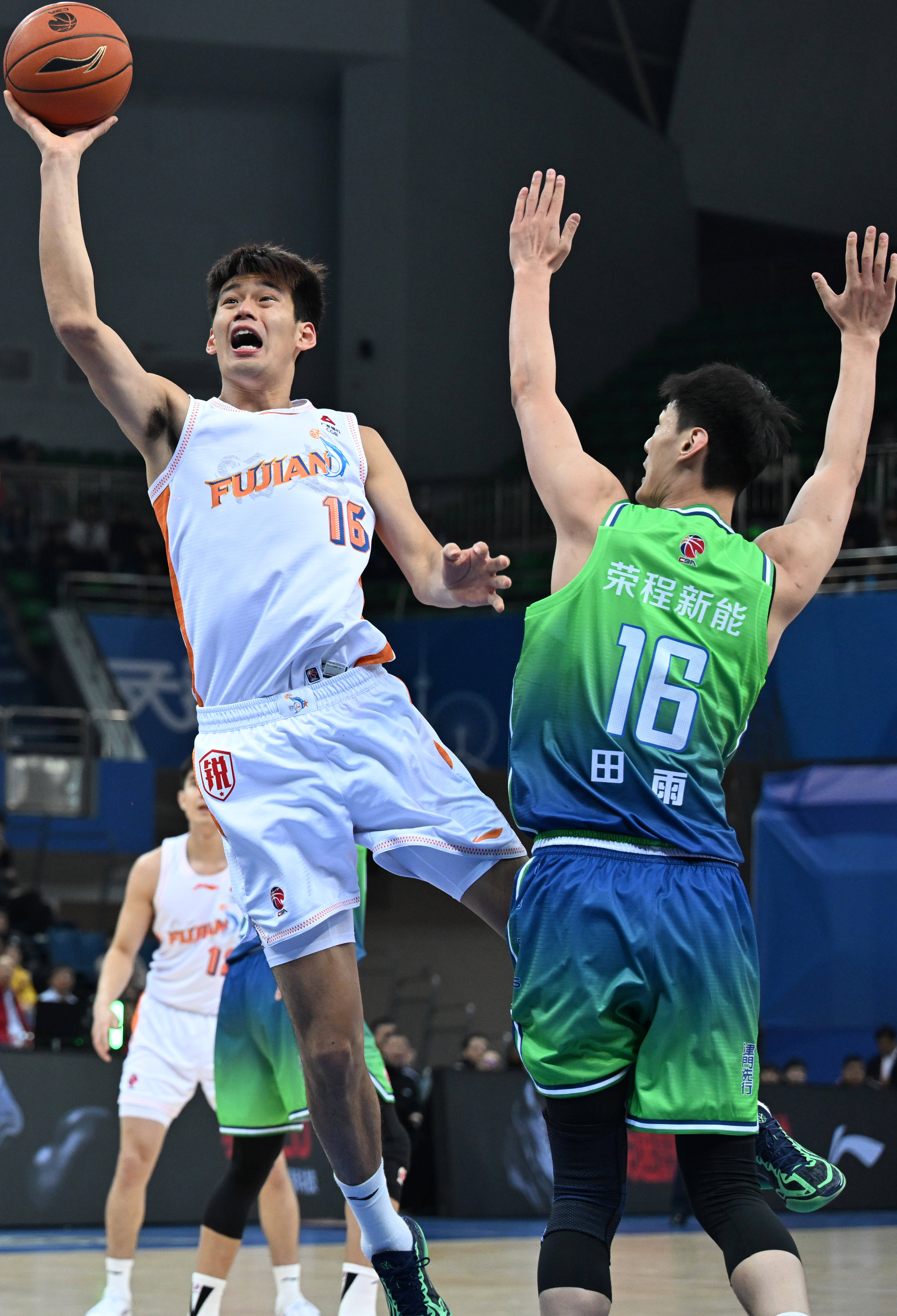 1月14日,福建晋江文旅队球员曾凌铉(左)在比赛中上篮。 新华社记者 赵子硕 摄