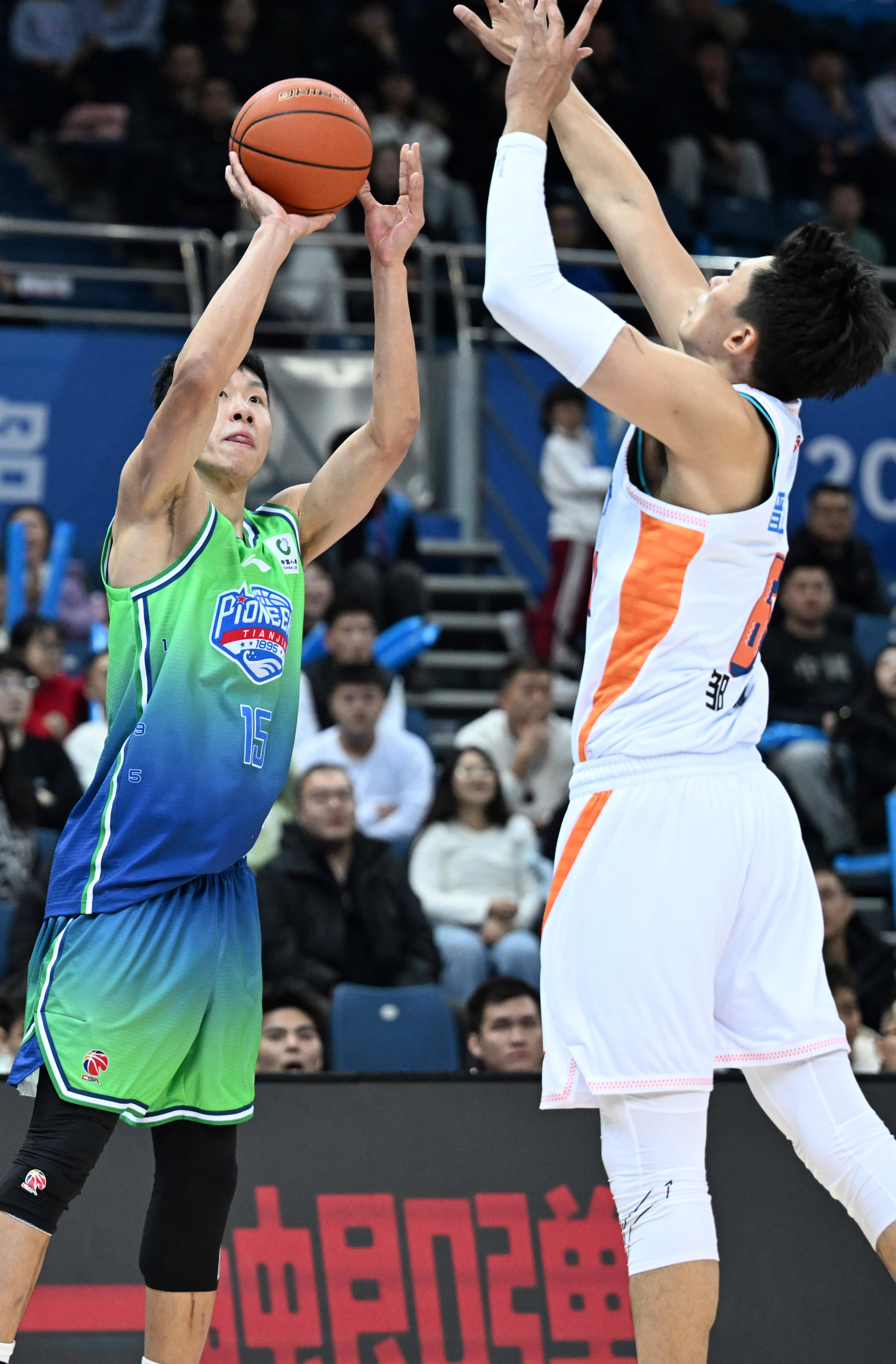 1月14日,天津先行者队球员郑昊燃(左)在比赛中投篮。 新华社记者 赵子硕 摄
