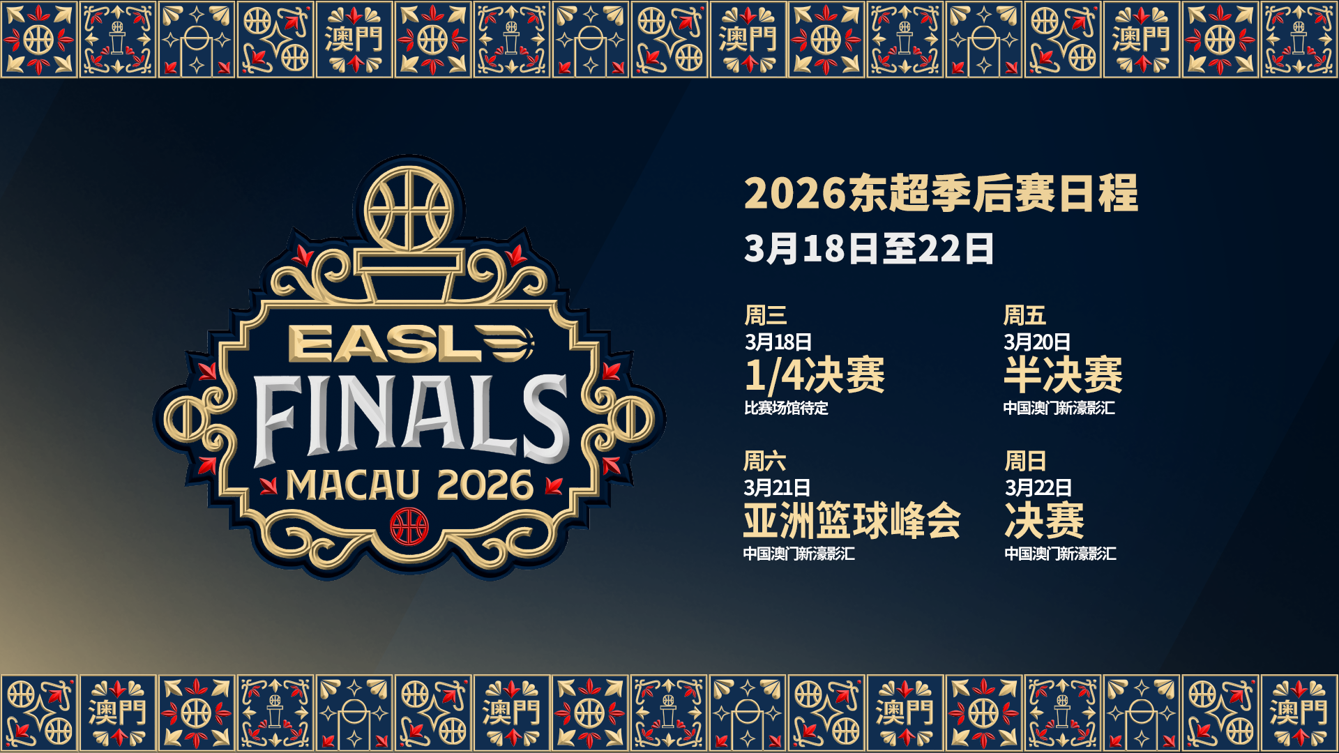 2026-01-29CBA,中国男子篮球职业联赛,CBA赛程,CBA直播,CBA比分,CBA投注/提供CBA最新赛程、实时比分、球队阵容、球员数据及盘口分析,服务中文球迷与篮球数据爱好者,让你全面掌握CBA最新动态。全新改版的2026东超季后赛(EASL Finals/东亚超级联赛季后赛)3月18至22日将在中国澳门特别行政区举办。届时,经历了常规赛的洗礼、从12支亚洲顶级球队脱颖而出的6支季后赛球队将展开更激烈的对抗,在东超历史规模最大、最成功的赛季共同见证亚洲篮坛新科冠军的诞生。