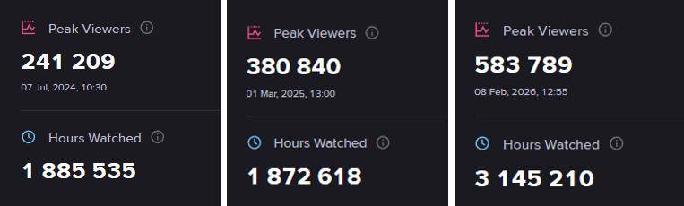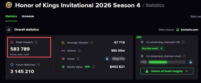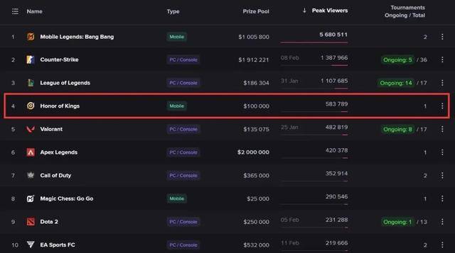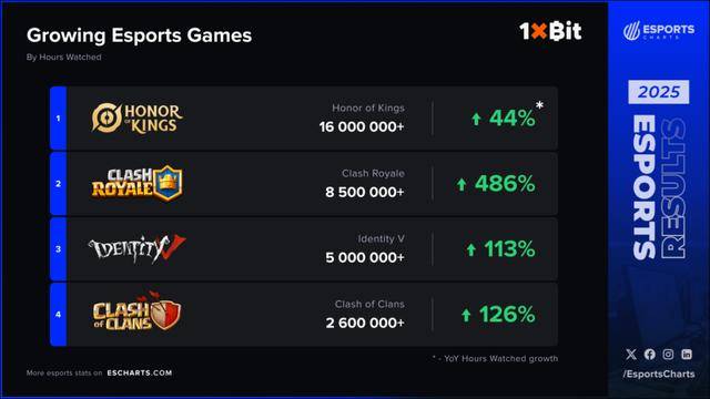 根据EsportsCharts的统计,2025年,《HOK》在全球前20大电竞赛事项目中,拿下了年度观看时长同比增长最高的好成绩;其中年度顶级赛事KIC2025的总观看时长更是突破300万小时,成为王者荣耀国际赛事历史上的里程碑之一。与此同时,《HOK》在全球电竞赛事观看峰值在线人数(PCU)榜单中排名第四,整体观赛热度与赛事影响力正在持续走高。