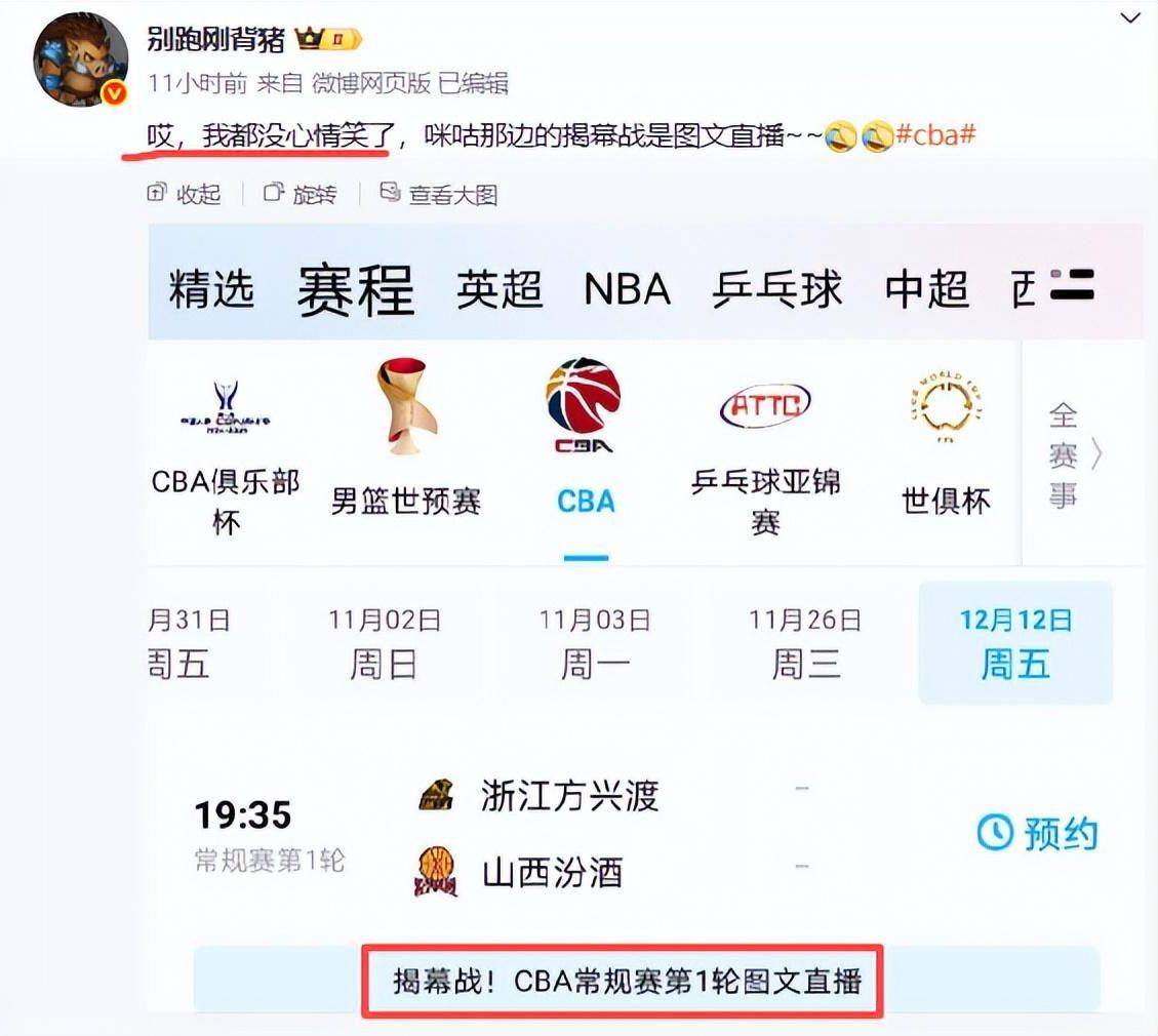 对于大部分比赛没有直播,媒体人也是进行吐槽。赵探长吐槽道:高中毕业就没看过图文直播了。别跑刚背猪说,cba的文字直播时代还真是挺久远的事情了,我记得cba最初的网络全场次直播好像还是13-15年之间的事情。他还直播表达:哎,我都没心情笑了,某咕那边的揭幕战是图文直播。