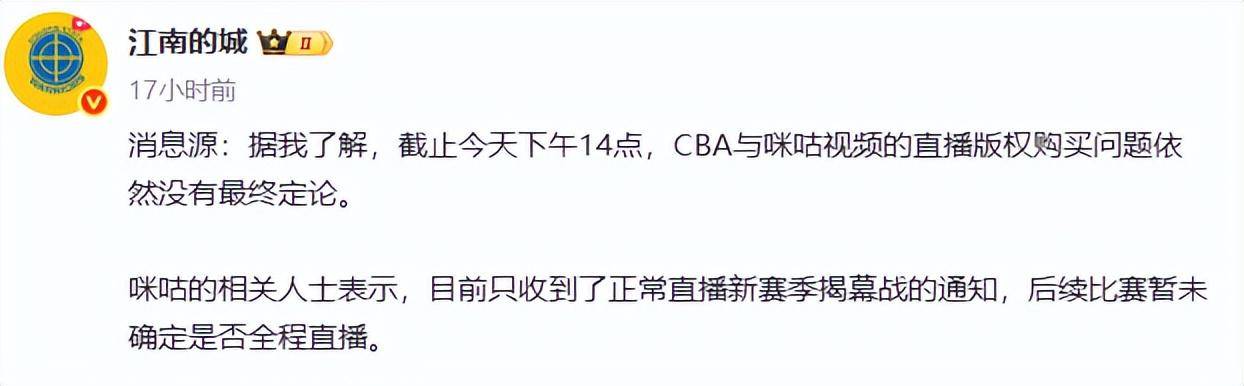 媒体人江南的城昨天报道:据我了解,截止今天下午14点,CBA与某咕视频的直播版权购买问题依然没有最终定论。某咕的相关人士表示,目前只收到了正常直播新赛季揭幕战的通知,后续比赛暂未确定是否全程直播。这就让球迷失望了,虽然央视每一天只直播一场,但是大部分场次我们看不了直播,只能有文字直播。也许最终CBA公司能与某咕谈妥直播权问题,我们就等待吧。但是究竟哪天谈妥,真是心里没有底。