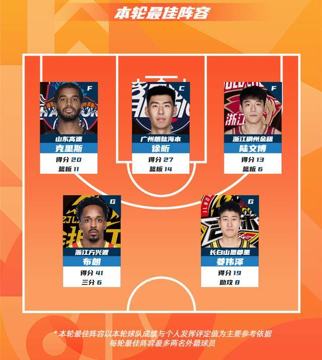 CBA联赛常规赛第4轮的最佳阵容,山东高速男篮的克里斯,广州龙狮男篮的徐昕,浙江稠州男篮的陆文博,浙江广厦男篮的布朗和吉林东北虎男篮的姜伟泽入选。
